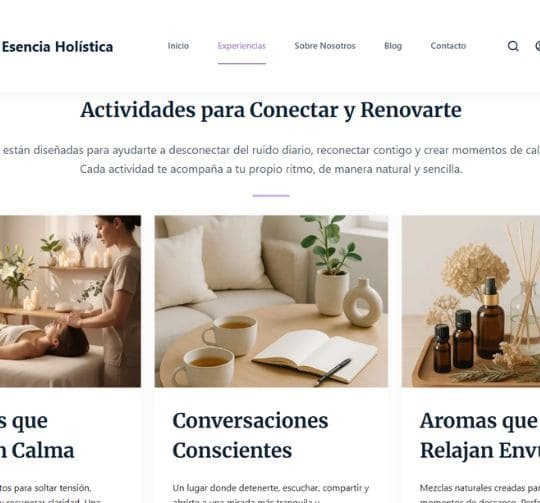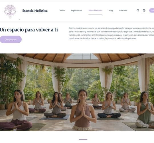 La arquitectura se distribuye en secciones principales, Inicio, Experiencias, Sobre Nosotros, Blog y Contacto, configurando un esquema sólido que permite explicar qué se ofrece, cómo se trabaja y cuál es la filosofía del proyecto. Esta distribución favorece una lectura progresiva, evitando saturación y reforzando la claridad en cada apartado.